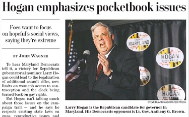 Staff writer John Wagner essentially allowed his 32-paragraph article, "Hogan emphasizes pocketbook issues," to function as a platform for the state's Democratic Party to rehash their tired "war on women" meme. "Foes want to focus on hopeful's social views, saying they're extreme" noted the subhead to Wagner's piece. Sure enough, Wagner focused almost exclusively on the complaints of those foes rather than on economic issues of import to Marylanders: