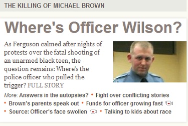 In the center of CNN.com's front page right now is a headline demanding, "Where's Officer Wilson?" "As Ferguson calmed after nights of protests over the fatal shooting of an unarmed black teen, the question remains: Where's the police officer who pulled the trigger?" a caption below a file photo of Wilson added.