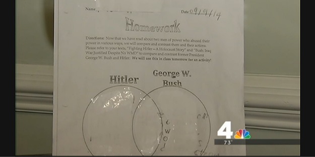A sixth grade teacher at Washington, D.C.'s McKinley Middle School gave students an assignment asking that they compare George W. Bush and his "abuse of power" with that of the late Nazi dictator Adolf Hitler. Local NBC-owned Washington station WRC-TV's Derrick Ward covered the controversy on the September 10 evening newscast. You can watch Ward's original report in the video below.