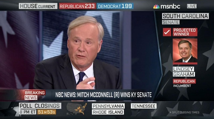 With the Kentucky Senate race called immediately for incumbent Republican Sen. Mitch McConnell, the MSNBC crew immediately went about portraying Democrat Alison Lundergan Grimes as an upstart who put up a valiant yet unsuccessful effort against a wily survivor of tight election campaigns. Grimes's surely has a bright political future, they all agreed, with Hardball host Chris Matthews lamenting that he was "sad" to see her lose.