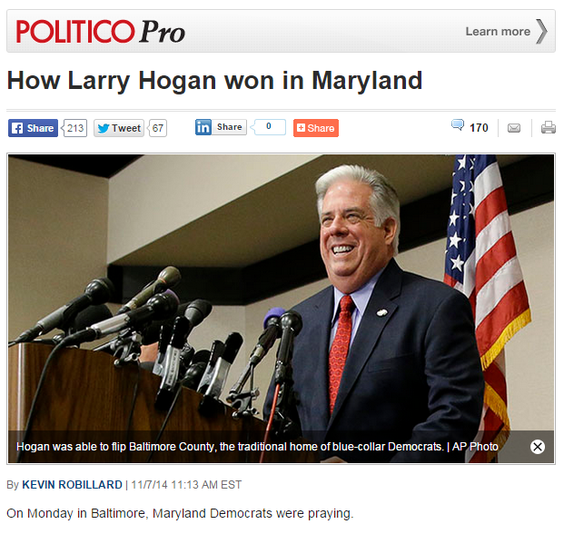 Over at Politico, Kevin Robillard devoted a story on November 7 to the matter of "How Larry Hogan won in Maryland." But throughout the story, Robillard weaved a narrative that almost if not completely pooh-poohed the idea that the Anne Arundel County businessman had anything of substance to do with his Tuesday night victory.