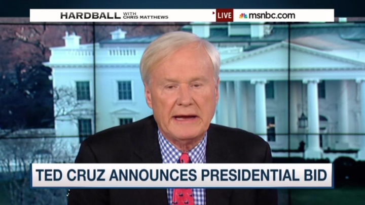 Chris Matthews was back at the helm of Hardball today after a week's vacation, and, fortuitously for him, the very same day his bête noire, Ted Cruz, announced for president before a supportive crowd at Liberty University. From start to finish, Matthews did not disappoint his audience, spewing out hateful invective about the junior senator from Texas, rehashing his tired talking points comparing Cruz to Joe McCarthy.