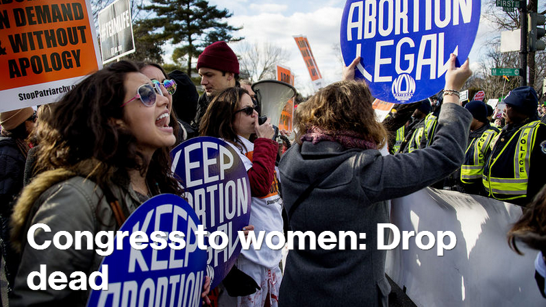 "Congress to women: Drop dead" thundered the main-page teaser headline. "GOP leadership would rather see survivors of trafficking get no help at all than allow women to determine the help that is best for them," added the subheader.