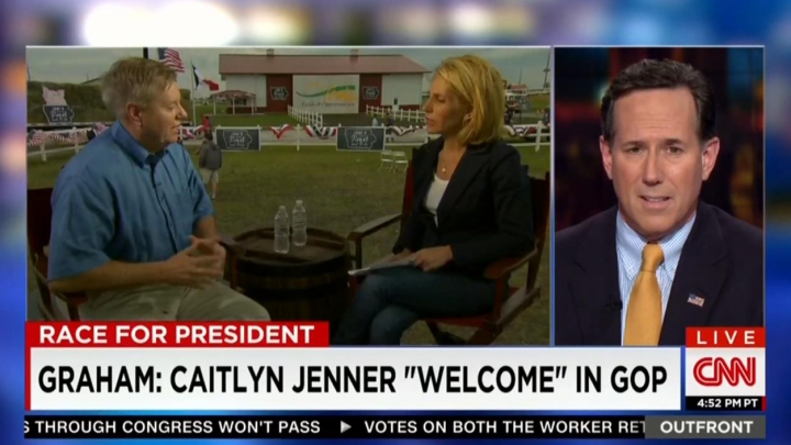 [Clip of Sen. LINDSEY GRAHAM to CNN's Dana Bash, as CNN shows split-screen with Santorum's reaction: I haven't walked in her shoes. I don't have all of the answers to the mysteries of life. I can only imagine the torment that Bruce Jenner went through. If Caitlyn Jenner wants to be a Republican, she is welcome in my party.]
