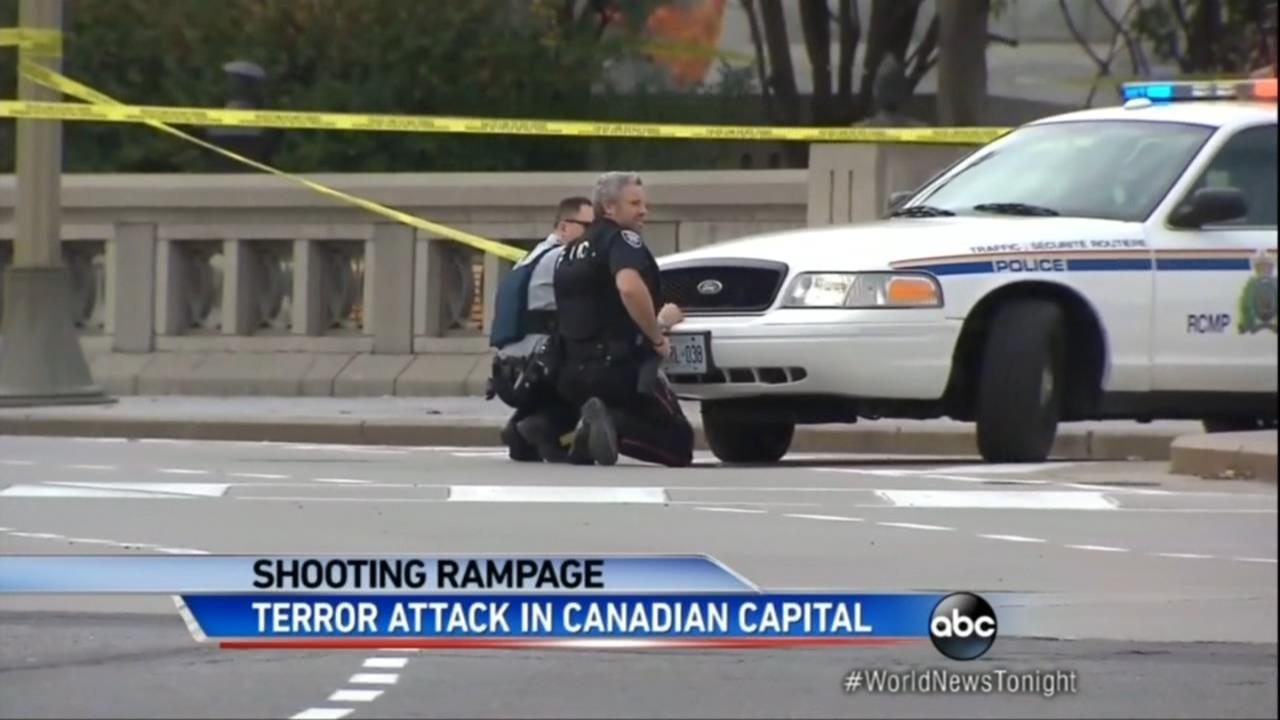 The leading story of the night was the attack on the Canadian Parliament building and the War Memorial in Ottawa. A shooter who was described as a recent convert to Islam went on a rampage first killing a soldier guarding a war memorial, before the man hijacked a car, drove to the parliament building and began shooting there. Police eventually shot and killed him.