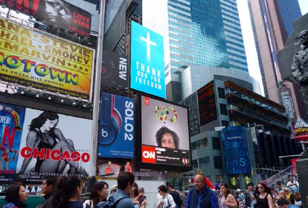 Answers in Genesis, an apologetics group, sponsored a blue billboard with a giant cross on it to appear from Dec. 30, through Jan. 1, 2015, according to The Christian Post. The fifteen-second digital billboard display reads “To all our intolerant liberal friends: Thank God for Freedom.” Christian Post said the message would relocate to a different Times Square billboard on Jan. 2, and later appear in other cities.