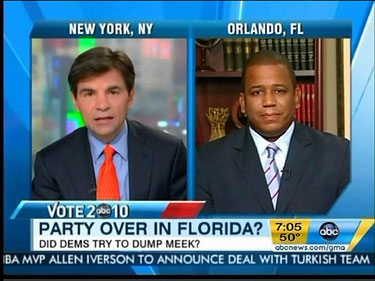 On Friday, the CBS Early Show and NBC's Today avoided any discussion of the Democratic Party's racial insensitivity in trying to get black Florida senate candidate Kendrick Meek to drop out of the race. On ABC's Good Morning America, co-host George Stephanopoulos quoted Republican National Committee Chairman Michael Steele on that very issue.