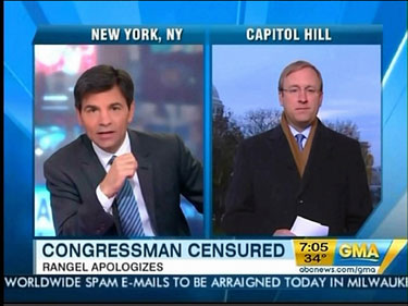 GEORGE STEPHANOPOULOS: Meanwhile, there was quite an unusual moment on the floor of the House yesterday, when Congressman Charles Rangel, long-time veteran of the House, former chairman of the House Ways and Committee [sic], was censured for various ethical violations. That's the first time in 27 years that's happened to a member of Congress. He had to accept the punishment. He then went to the floor to apologize.