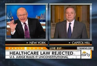 No Republican guests or sound bites were featured in the segment. In a report prior to Smith's interview with Durbin, congressional correspondent Nancy Cordes did repeat a quote from the GOP: "Republicans, who universally oppose the health care law, praised the Virginia ruling. In a written statement, incoming House Majority Leader Eric Cantor said, 'Once the new Republican majority assumes control of the House in January, we will pass a clean repeal of ObamaCare.'" She quickly added: "The White House argues the insurance mandate is critical to the success of health care reform. Because getting everyone insured is key to bringing down costs."