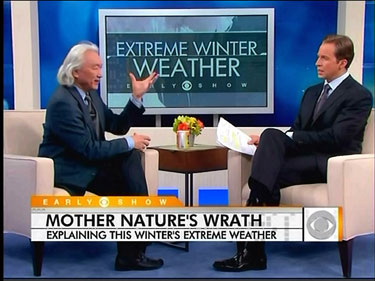 Speaking to physicist Michio Kaku on Wednesday's CBS Early Show, co-host Chris Wragge fretted over the recent series of severe winter storms and wondered: "...nine storms in seven weeks, why is this happening?...a lot of people want to talk about global warming and thinking that that may actually come into play here. Is that accurate? Is that having an effect on what's going on?"