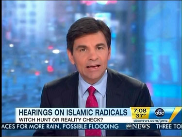 On ABC's Good Morning America on Wednesday, co-host George Stephanopoulos fretted over congressional hearings on the radicalization of American Muslims being "potentially explosive" and that "Critics are already calling this a witch hunt." The headline on screen throughout the segment read: "Hearings on Islamic Radicals: Witch Hunt or Reality Check?"