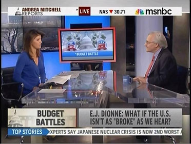 E.J. DIONNE: What does it mean – good to be with you, by the way – what does it mean when we say we're 'broke'? It means we've run out of money, we can't increase our income, we've got to go into bankruptcy court or something like that. If you take the federal government, we are in this strait partly because of an economic downturn, when things get better, when the economy gets better, revenue comes in. We're also in this trouble because we cut taxes and started two wars at the same time back at the beginning of the last decade. And-