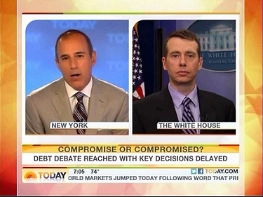 In an interview with White House advisor David Plouffe on Monday's NBC Today, co-host Matt Lauer worried about liberals being unhappy with the proposal deal on the debt ceiling: "So did the President compromise here, David, or did he give in simply so that he wouldn't be labeled as the president who was on duty as the nation defaulted on its financial obligations?"