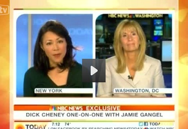 A clip was played of Gangel grilling Cheney on terrorist interrogations: "Should we still be waterboarding terror suspects?" Cheney replied: "I would strongly support using it again if circumstances arose where we had a high value detainee and that was the only way we could get them to talk." Gangel fretted: "Even though so many people have condemned it. People call it torture. You think it should still be a tool?"