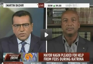 Teasing his Friday 3 p.m. ET hour show on MSNBC, anchor Martin Bashir proclaimed that he would have a special guest on to discuss incoming Hurricane Irene: "Former New Orleans Mayor Ray Nagin joins us to explain what leaders must do to avoid the mistakes that were made six years ago." [Audio available here]