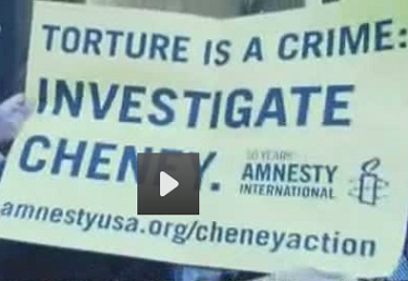 At the end of the contentious interview, Lauer declared: "Mr. Cheney, thanks for being with us this morning. I appreciate it." However, as the camera panned out of the studio, it zoomed out to show a protest sign just outside from Amnesty International that read: "Torture is a Crime: Investigate Cheney."