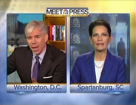 Earlier, Gregory played a clip of Bachmann from Saturday's CBS News foreign policy debate in which she criticized Obama's war on terror strategy: "It is as though we have decided we want to lose in the war on terror..." Gregory sounded like a White House spokesman as he demanded from the Congresswoman: "Did you feel that way after he killed Osama Bin Laden, ordering that raid? Did you feel that way after he ordered more drone attacks on terrorists in Pakistan than the previous administration?"