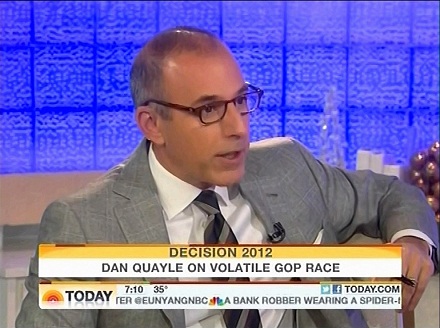 Quayle endorsed Romney on Tuesday, prompting Lauer to ask: "You've seen the polls, he's always between 20 and 25%. Conservatives have tried to find anybody to pass him....why is he the Rodney Dangerfield of the race, Mitt Romney, why doesn't he get any respect?" The headline on screen throughout the segment read: "Decision 2012; Dan Quayle on Volatile GOP Race."
