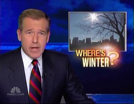 On Tuesday's NBC Nightly News anchor Brian Williams fretted over winter doing a "disappearing act" and proclaimed: "It was so warm today across much of the country, as you know, they're calling it June-uary. It's got a lot of people wondering whatever happened to winter?" The headline on screen pondered: "Where's Winter?"
