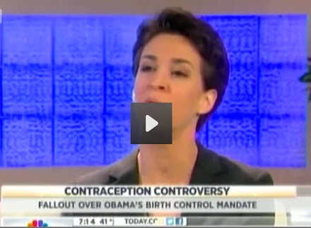 After finally deciding to actually cover the controversy swirling around the Obama administration's attempt to force Catholic institutions to pay for birth control in health insurance plans, NBC's Today on Tuesday brought on leftist MSNBC host Rachel Maddow to dismiss all legitimate opposition to the move as a "pretty far-right perspective" and "an extension of anti-abortion politics." [Listen to the audio or watch the video after the jump]