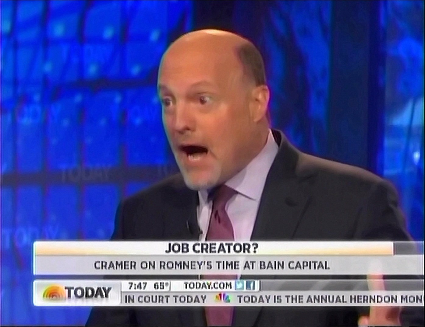On Tuesday's NBC Today, co-host Matt Lauer invited CNBC Mad Money host Jim Cramer to elaborate on calling Mitt Romney a "job destroyer" as the head of Bain Capital on Sunday's Meet the Press: "You speaking as a pundit, or do you have some experience here?" Cramer declared: "He was talking about rationalizing the workforce, making it so that the companies were more efficient. Matt, these were code words back then. Code words for firing people."