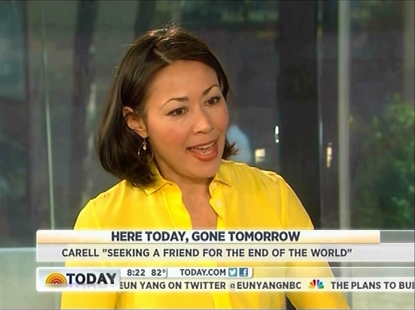 MediaBistro's TVNewser blog picked up on an "unfortunate lower third" on Thursday's NBC Today, referring to a headline that appeared on screen as reportedly outgoing co-host Ann Curry was interviewing actor Steve Carrell about his new movie, Seeking A Friend for the End of the World. The graphic read: "Here Today, Gone Tomorrow."