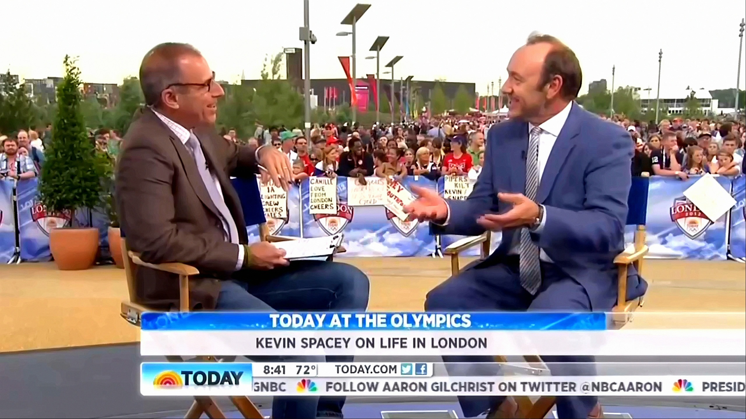 MATT LAUER: We welcome you back now to London and day five of the games of the XXX Olympiad. And look who we found taking in some of the action, two-time Oscar winner Kevin Spacey. For nearly a decade he's served as the artistic director of the Old Victory Theater here in London. Kevin, it's good to see you on your side of the pond for a change.