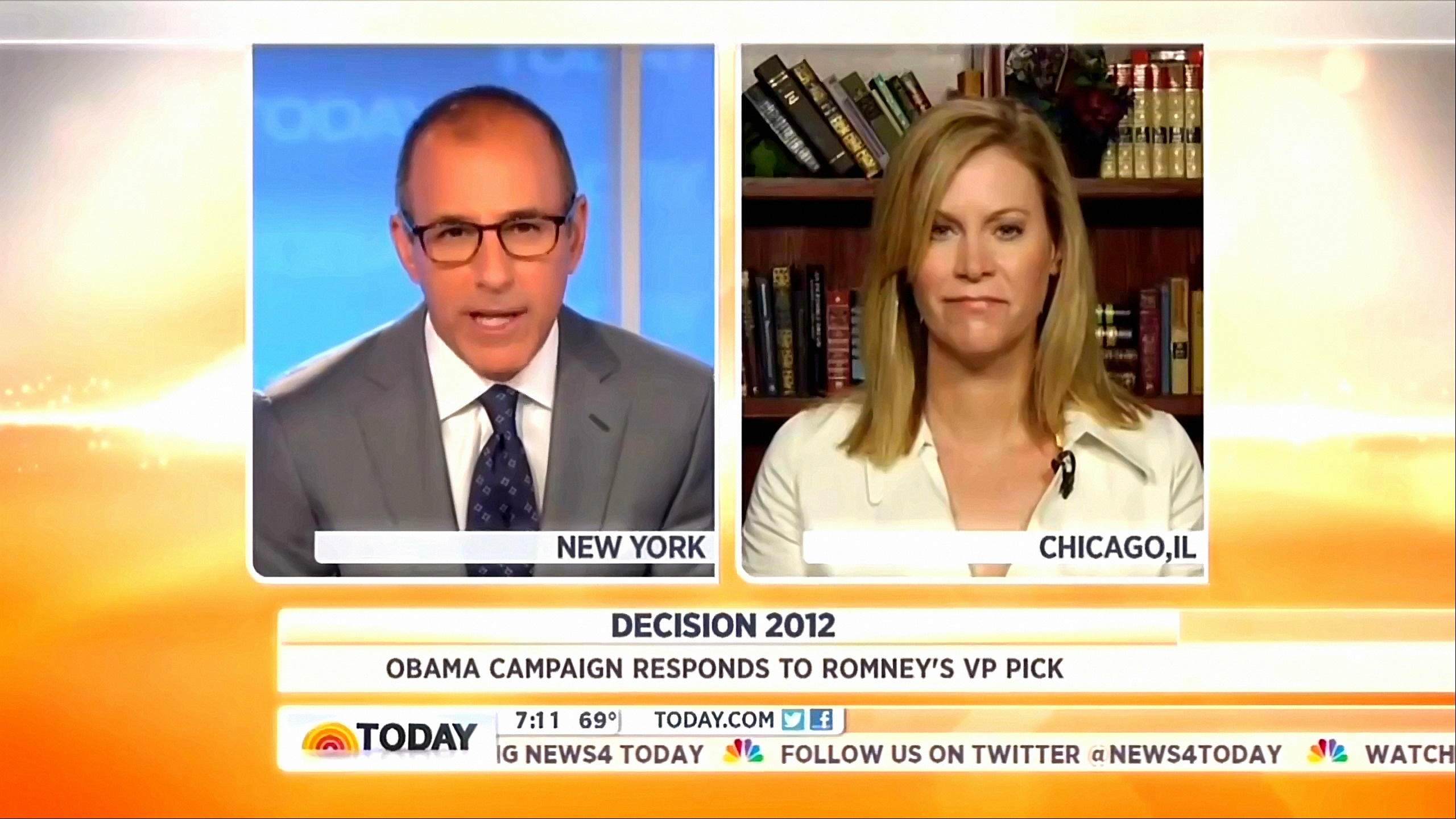 Prior to Lauer's interview with Cutter, fellow co-host Savannah Guthrie talked to Romney campaign senior advisor Kevin Madden and suggested the pick of Ryan was a sign of Romney losing: "Governor Romney's been getting a lot of credit for making a bold, game-changing choice here. It strikes me that you don't make a choice like that if you think you are winning the campaign. Is this a tacit acknowledgment the strategy Romney had before, just running against the Obama economy, is not working?"