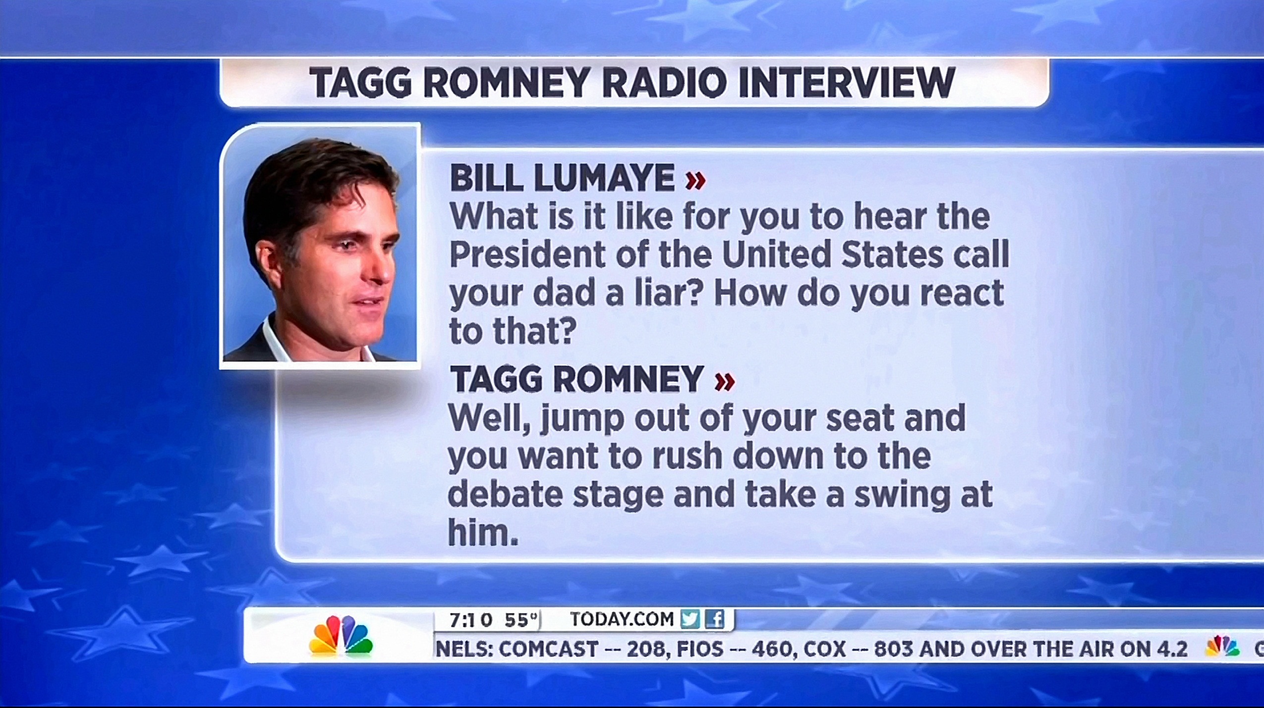 Introducing a campaign report minutes later, Guthrie declared the Romney son's comment in jest was "making some waves." Correspondent Peter Alexander promised viewers, "We'll play that comment for you from Tagg Romney in just a moment." For all the build-up to the supposedly controversial comments, at the end of his report, Alexander revealed the light-hearted nature of them: "During a radio interview Wednesday, Governor Romney's oldest son Tagg joked about his reaction to some of the contentious exchanges during Tuesday's debate."
