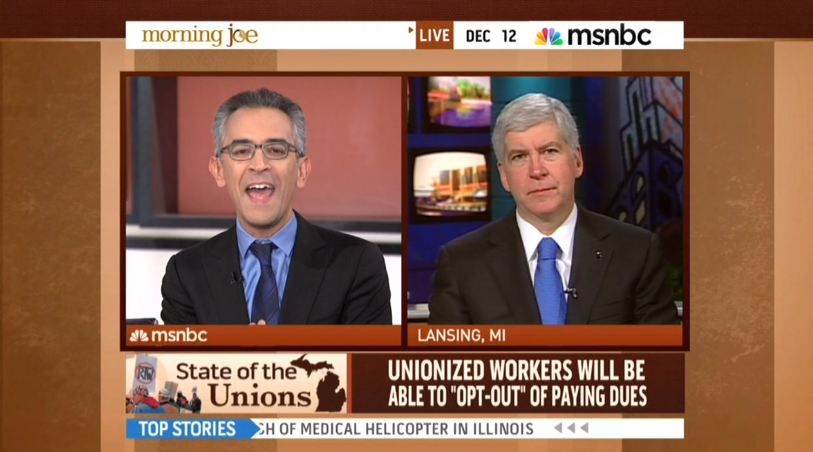 Contributor Richard Wolffe led off the disrespectful display when Snyder defended the new law: "I don't believe this is actually anti-union. If you look at it, I believe this is pro-worker." Wolffe started laughing and rudely interrupted: "Hang on a second. Are you really – are you serious? Are you serious? This is not anti-union? This actually, at its core, undermines the ability for unions to organize. So you can make many arguments you like, but saying it's not anti-union..."