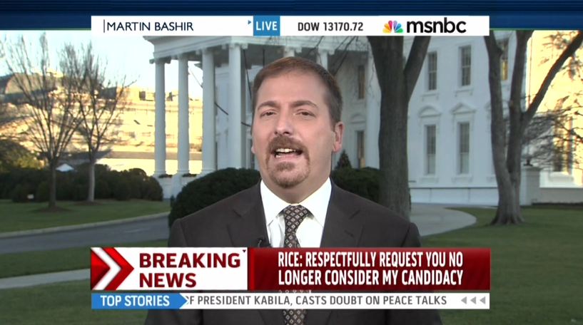 Moments after news broke of U.N. Ambassador Susan Rice withdrawing her name from consideration to be secretary of state, NBC chief White House correspondent Chuck Todd appeared on MSNBC's Martin Bashir to denounce those he deemed responsible: "It was all driven, in many cases, by some conservative outlets who were making her the center of the Benghazi story....[which] never made a lot of sense. She sort of became a victim of this." [Listen to the audio or watch the video after the jump]