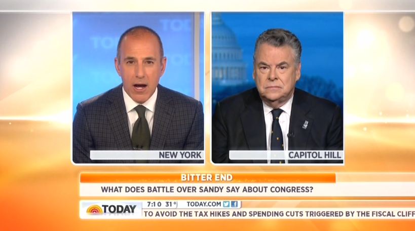 At the top of Thursday's NBC Today, co-host Matt Lauer teased an upcoming interview with New York Congressman Peter King by seizing on House GOP disagreement over when to schedule a vote on a Hurricane Sandy relief bill: "...fresh off the fiscal cliff fight, the Republican Party appears in the throes of a civil war. This morning, we'll talk to an outspoken GOP congressman who urged voters in his district not contribute to Republican campaigns." [Listen to the audio or watch the video after the jump]