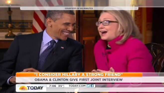 Following the friendly chat President Obama and outgoing Secretary of State Hillary Clinton had with CBS's Steve Kroft on Sunday's 60 Minutes, NBC's reporters could barely contain their glee over the duo getting along so well, with correspondent Peter Alexander proclaiming on Monday's Today: "There they were, side-by-side, at times chuckling together, it seemed even finishing one another's sentences." [Listen to the audio or watch the video after the jump]