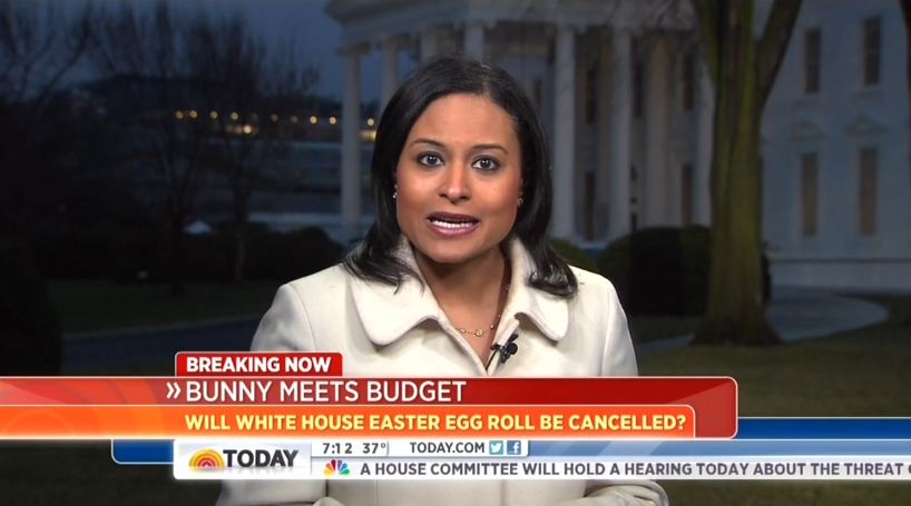 On Tuesday's NBC Today, news reader Natalie Morales warned viewers: "With a potential government shutdown looming later on this month, the White House may have to cancel its annual Easter Egg Roll." In the report that followed, White House correspondent Kristen Welker added that the "event might be in jeopardy....due to the ongoing budget battles here in Washington." [Listen to the audio or watch the video after the jump]