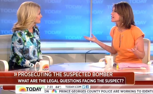 On Monday's NBC Today, co-host Savannah Guthrie and legal analyst Lisa Bloom worried about Boston Marathon bombing suspect Dzhokhar Tsarnaev not yet being read his Miranda rights after being taken into custody on Friday, with Guthrie arguing: "...officials are citing what's known as the public safety exception....As time passes, does the justification for that exception grow weaker? Are they on, I guess, less strong ground?" [Listen to the audio or watch the video after the jump]
