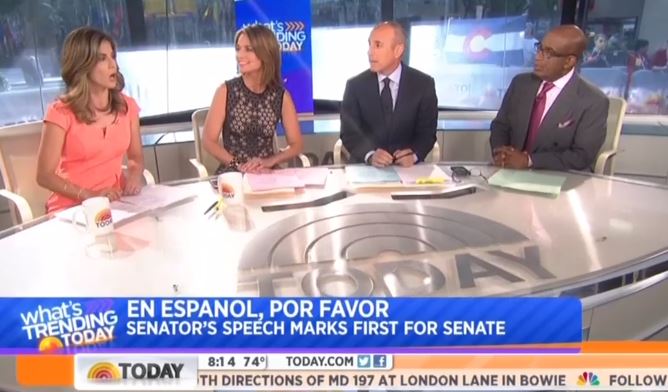 Guthrie noted some mixed reaction: "This was to the delight of some Hispanic civil rights groups. But one of those groups actually said they wanted the immigration debate to be something that everyone could understand, thought it should be in English." However, she happily concluded: "Nevertheless, it's hard to get a first these days, especially in the U.S. Senate. This apparently was one."