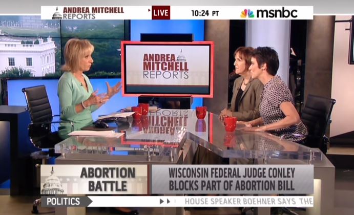 Mitchell's guests, The Washington Post's Karen Tumulty and Cook Political Report's Amy Walter, engaged in a political strategy session on how abortion activists could frame the debate in their favor. Tumulty declared: "...the more the debate is about the fetus – which is what this twenty-week ban is – the more the anti-abortion side wins. But the more it is about the woman and her access to abortion and her ability to make this decision herself, the more that the abortion rights advocates win."