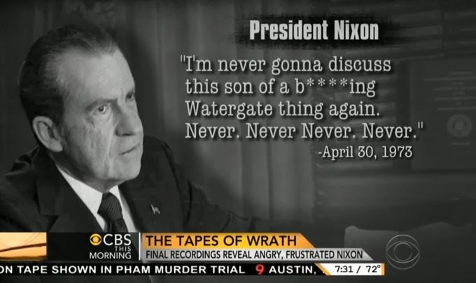 NIXON: God d*** it, I'm never going to discuss this son-of-a-b******* Watergate thing again. Never. Never. Never, never.
