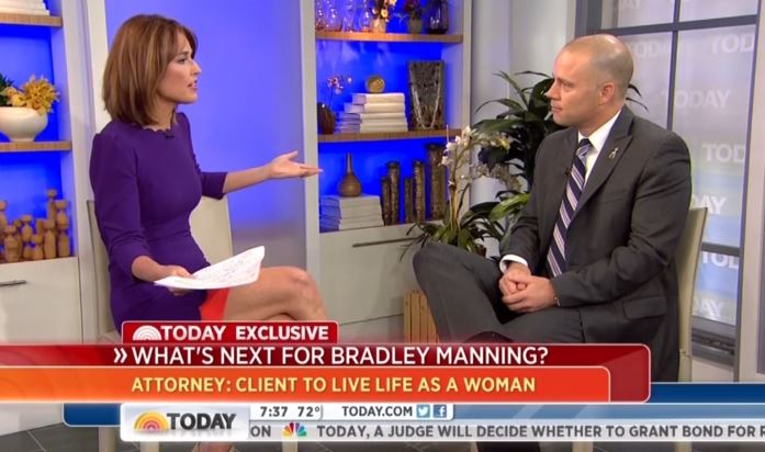 In an exclusive interview with Bradley Manning's attorney David Coombs on Thursday's NBC Today, co-host Savannah Guthrie read a "bombshell announcement" from the convicted military leaker: "I want everyone to know the real me. I am Chelsea Manning. I am a female." After referring to Manning as "he" throughout the segment, Guthrie immediately switched pronouns: "Why did she choose this moment to announce this?" [Listen to the audio or watch the video after the jump]