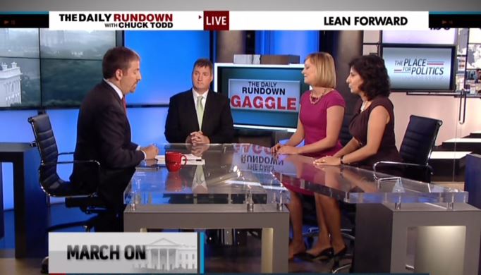 On Thursday's MSNBC Daily Rundown, host Chuck Todd laid blame for Republicans not speaking at Wednesday's anniversary of the 1963 march on Washington on the GOP, rather than event organizers: "...the Bushes couldn't go, there were health reasons why neither President Bush could go and speak. Other Republicans leaders were invited to speak and they politely declined. In hindsight, do you wish there had been Republicans that had agreed to speak?" [Listen to the audio or watch the video after the jump]