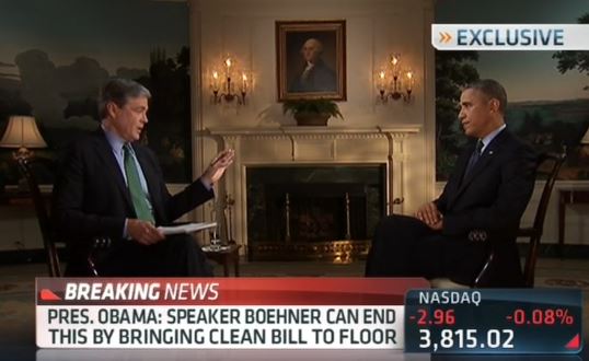 In an exclusive interview with President Obama on Wednesday, CNBC chief Washington correspondent John Harwood lobbed this softball on the political fallout of the government shutdown: "Before the election last year, you said you thought there was a possibility your re-election would break the fever within the Republican Party. Didn't happen. Do you see this moment as a chance, through this political confrontation, to break the fever now?" [Listen to the audio or watch the video after the jump]
