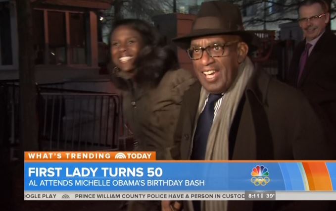 Calling in to Monday's NBC Today, weatherman Al Roker was giddy as he told his fellow co-hosts about attending Michelle Obama's White House birthday party: "...it was literally a house party. It was a house party that happened to be in the White House. My wife Deborah and I went. And it was – yeah, there were all these stars, which was kind of terrific." [Listen to the audio or watch the video after the jump]