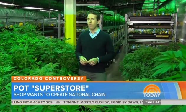 Teasing an upcoming report on Monday's NBC Today, co-host Savannah Guthrie announced: "...the big-box store of weed? One Colorado company's plan to bring their controversial product to states coast to coast." In the report that followed minutes later, correspondent Gabe Gutierrez was shown standing in a room filled with marijuana plants at the Denver-based pot store and proclaimed: "If you thought pot retailers in Colorado were all tiny shops run by stoners, you'd be wrong. We're here at Medicine Man, and they call this vegetation room the green mile. It's part of a long road to making this a national pot franchise." [Listen to the audio or watch the video after the jump]