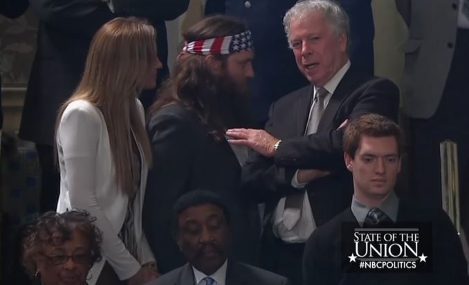 Minutes before Todd's rant, Capitol Hill correspondent Kelly O'Donnell had noted Robertson's attendance: "One of the reality TV stars of Duck Dynasty, Willie Robertson, is here with his star-spangled bandanna. And there has been a parade of members, Republican members of the House, who've come from the floor up to the second level to shake hands with him."