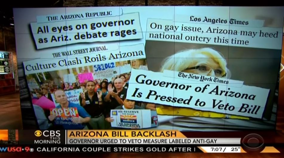 CBS This Morning co-host Norah O'Donnell hyped: "Governor Jan Brewer is back in Arizona this morning and she's facing a firestorm. She must decide on a bill that's ignited days of protest." Following sound bites of protestors chanting "Veto! Veto! Veto!" and "Shame on you! 1062!"  correspondent Jan Crawford described "a tidal wave of opposition to the proposed state law which would make it easier for businesses, because of their religious beliefs, to deny service against gays and lesbians."