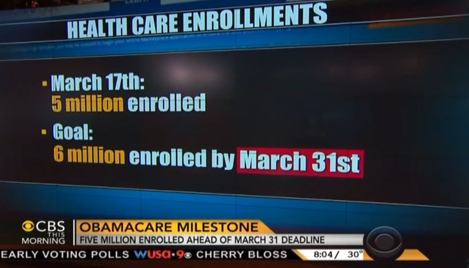 The headline on screen announced: "ObamaCare Milestone; Five Million Enrolled Ahead of March 31 Deadline." Mason continued: "As of yesterday, 5 million people are now enrolled for either state or federal insurance. The administration's goal is 6 million. The open enrollment deadline is March 31st."