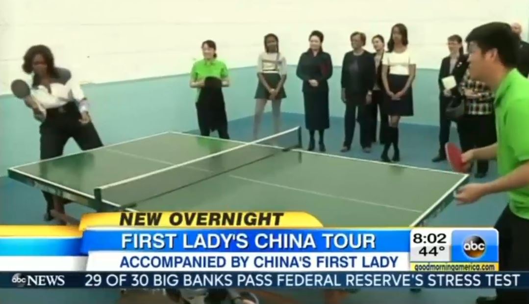 ABC's Good Morning America, which skipped the China visit on Thursday, only offered a news brief on Friday, with fill-in news reader Amy Robach gushing: "[Michelle Obama] played a little ping pong this morning in Beijing as she started a week-long trip to China. Nice moves there, Mrs. Obama."