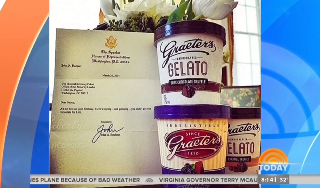 TAMRON HALL: Maybe John Boehner was trying to be likable at work, because the House Speaker knows that his Democratic counterpart Nancy Pelosi just loves chocolate. So, for her 74th birthday on Wednesday he gave her something sweet, pints of chocolate gelato.