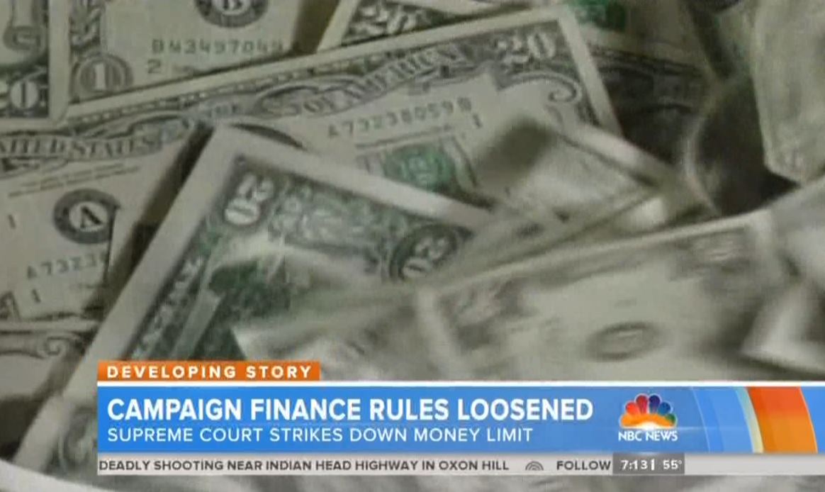 [ON-SCREEN HEADLINE: Campaign Finance Rules Loosened; Supreme Court Strikes Down Money Limit]