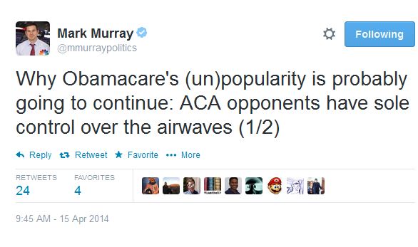 In the first of a series of tweets sent out Tuesday morning, NBC senior political editor Mark Murray complained: "Why ObamaCare's (un)popularity is probably going to continue: ACA opponents have sole control over the airwaves." In a follow-up tweet, Murray cited the Campaign Media Analysis Group: "Per CMAG's Elizabeth Wilner, number of anti-Obamacare commericials since March 31: 32 Number of pro-Obamacare commercials: 0"